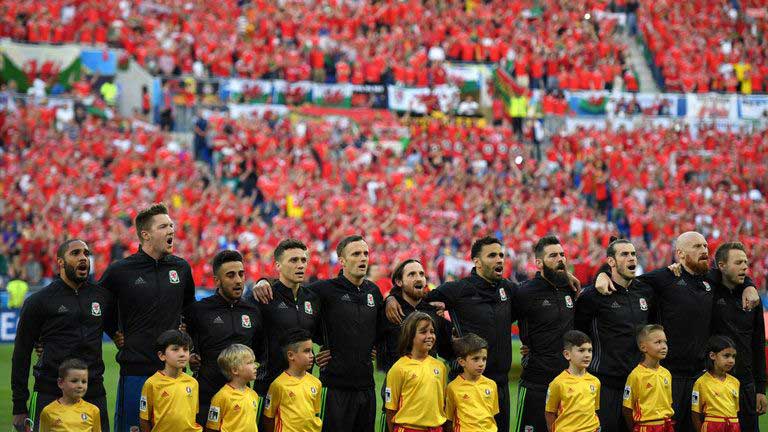 Cefnogwyr a thîm Cymru yn canu'r anthem cyn y gêm bêl-droed yn erbyn Iwerddon yn Stadiwm Dinas Caerdydd ym mis Hydref 2017: